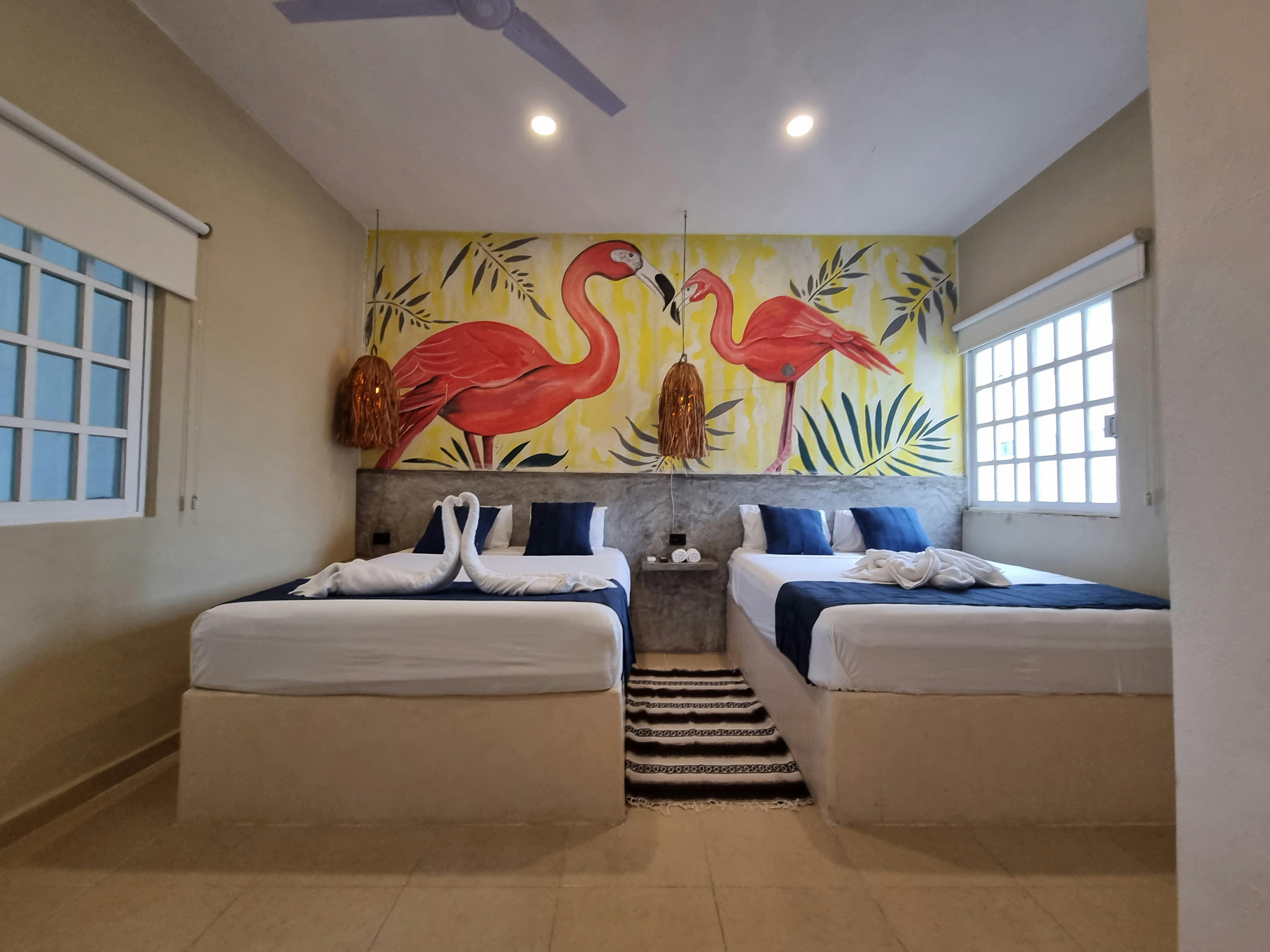 Beautiful room with two Queen beds, a work desk, Smart TV, and a private bathroom.